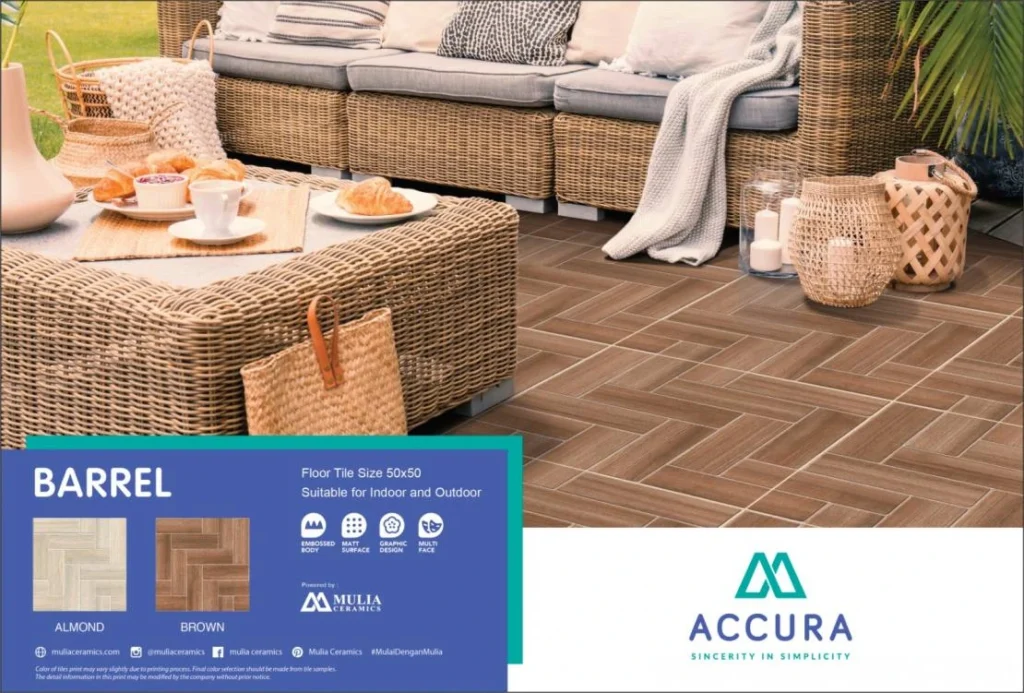 Ingin nuansa hangat seperti villa di pegunungan? Anda tidak perlu repot merawat kayu asli yang mudah lapuk. Gunakan keramik motif kayu dari Barrel Series. Dengan teknologi cetak digital terkini, serat kayunya terlihat sangat realistis namun tetap tahan banting terhadap cuaca panas maupun hujan. Teras Anda akan terasa lebih homey dan mengundang.